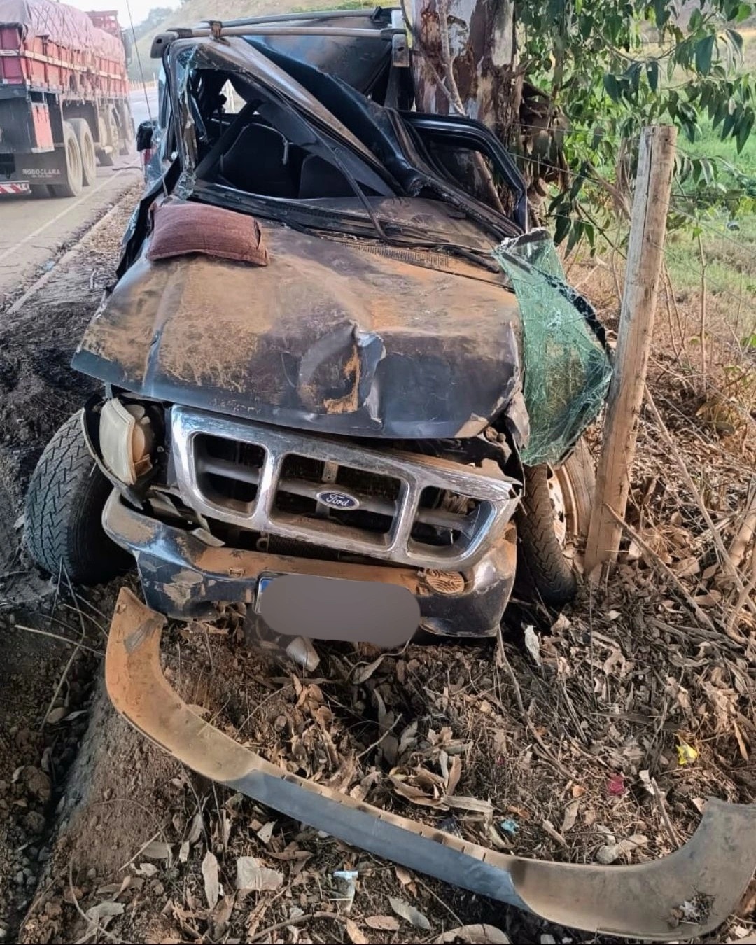 De acordo com relatos repassados á Polícia Militar Rodoviária, a batida ocorreu quando uma caminhonete Ford Ranger saiu de um posto de combustível e colidiu com um caminhão, que a arrastou e a prensou contra uma árvore.