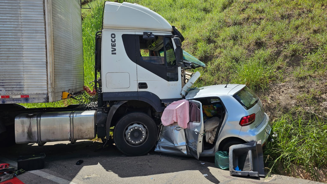 A colisão envolveu uma carreta e dois automóveis, um Gol e um Prisma.