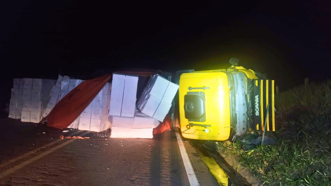Com o impacto, a carreta tombou e ficou atravessada na pista.