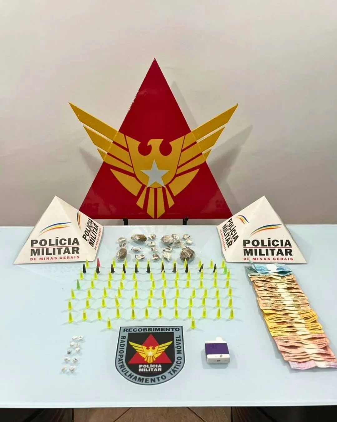 Dentro da sacola, os policiais encontraram 10 pedras de crack, 86 pinos de cocaína, 19 buchas de maconha, um cigarro eletrônico e R$ 995,00 em dinheiro.