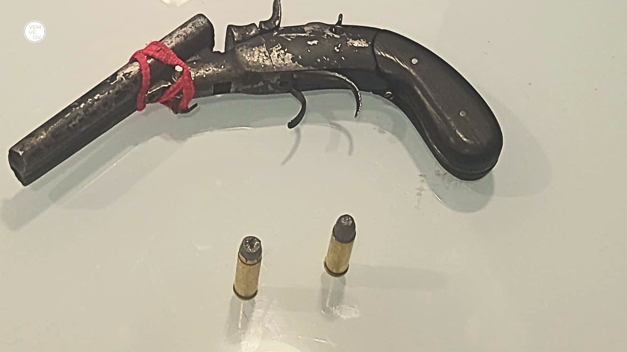 Após buscas no interior do imóvel, nada foi encontrado. No entanto, ao retornar para a rua, os policiais localizaram uma garrucha calibre .32 com duas munições intactas caída na calçada, em frente à residência.