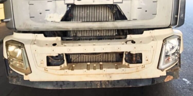 O caminhão foi autuado por mau estado de conservação, ausência de placa dianteira, falta de equipamento obrigatório e sistema de iluminação e sinalização inoperante.