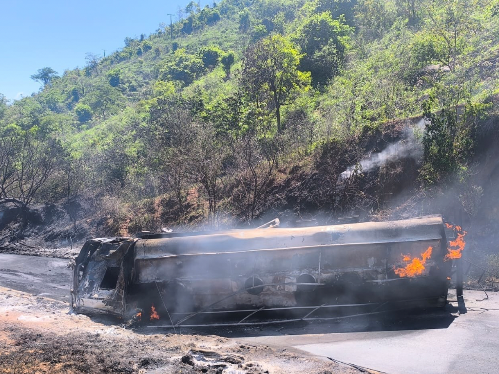Um caminhão-tanque, que transportava combustível, perdeu o controle enquanto descia uma serra, colidiu e explodiu, resultando em um incêndio de grandes proporções.