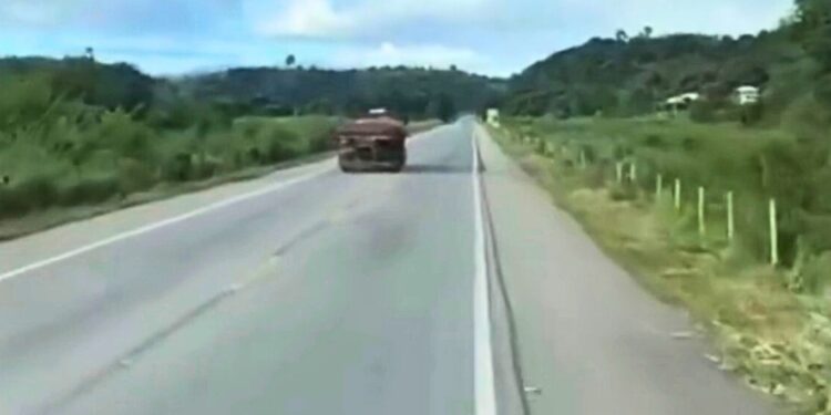 Um vídeo gravado na BR-116, próximo ao município de Frei Inocêncio, no Leste de Minas, mostra um caminhão circulando de forma desgovernada pela rodovia.