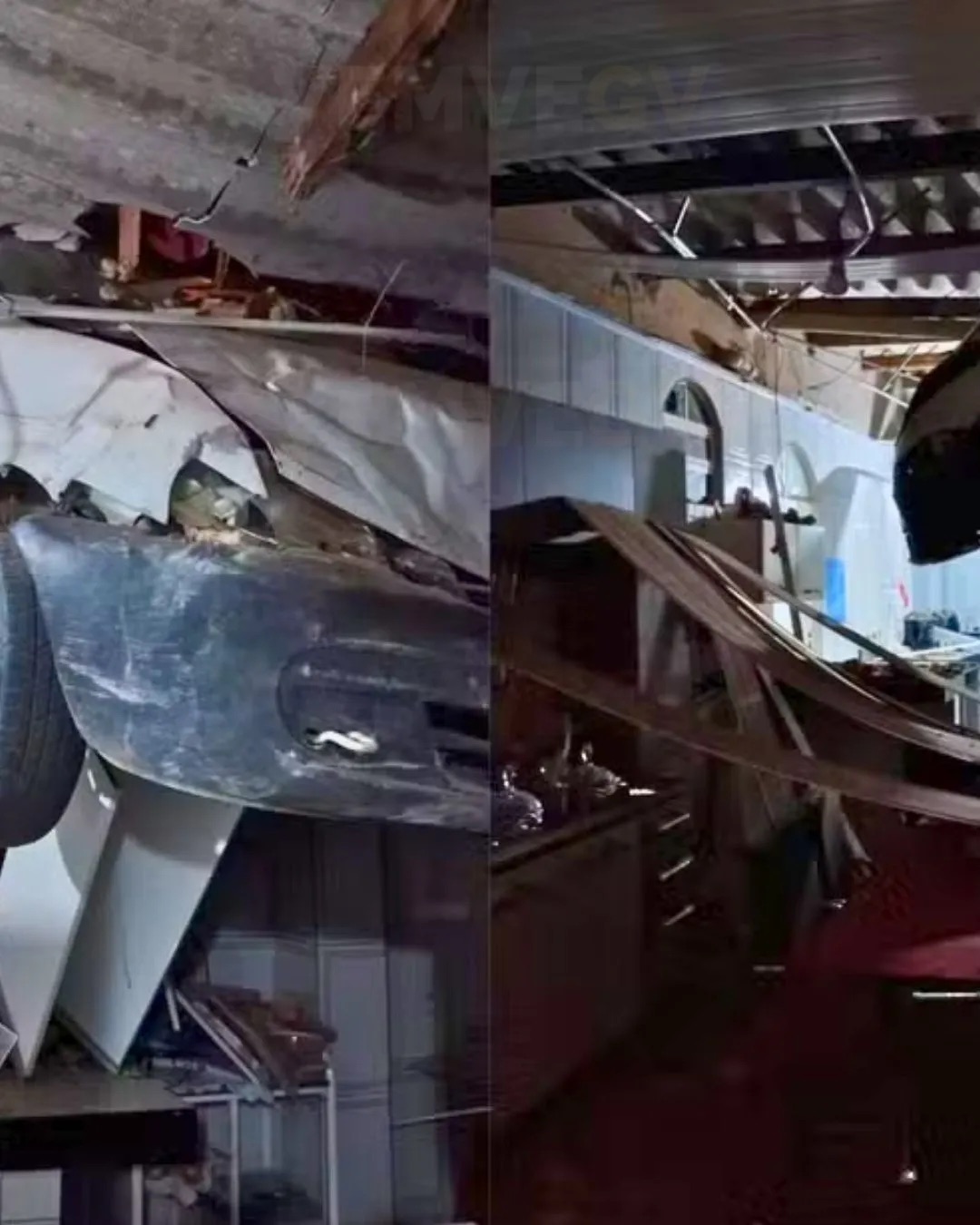 A traseira do veículo permaneceu na calçada, presa ao muro que foi atingido durante a batida, enquanto a parte da frente atravessou a parede e invadiu a cozinha, causando um grande estrago.