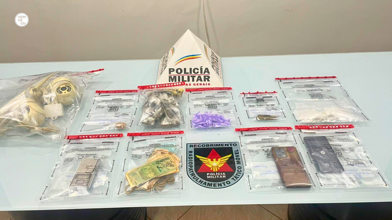 Ao verificarem o local onde os materiais foram arremessados, os policiais encontraram uma sacola contendo 46 pinos de cocaína, 40 buchas e 19 tabletes de maconha, uma porção adicional da droga, um pacote com diversas pedras de crack já fracionadas, uma balança de precisão e diversas embalagens utilizadas para endolação.