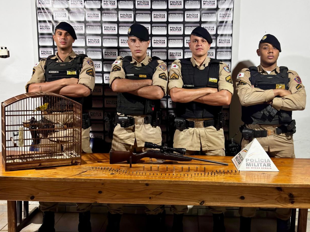 Além do rifle e das munições, os policiais apreenderam o pássaro silvestre, que será encaminhado às autoridades ambientais.