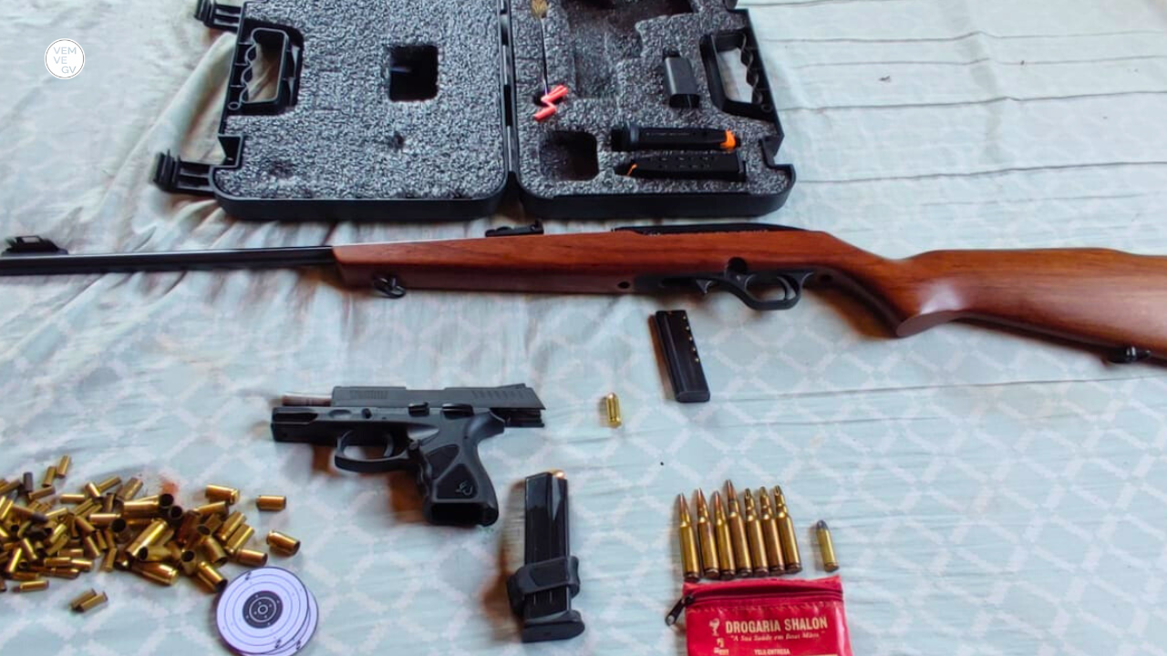 Na casa do outro preso, alvo do mandado por posse ilegal de arma, a polícia encontrou uma carabina calibre .22, um rifle .44, um revólver calibre .38, além de munições e acessórios.