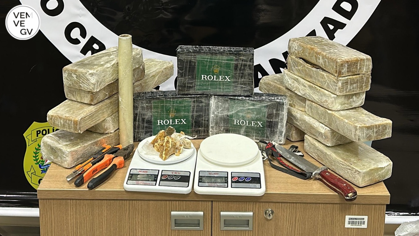 No total, foram apreendidos 15 tabletes de pasta base de cocaína ( cerca de 15 kg ), três barras de cloridrato de cocaína ( 3,7 kg ), duas balanças de precisão, dinheiro em espécie e celulares.