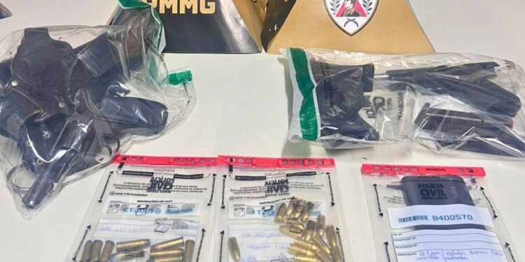 No quintal da casa, os policiais encontraram quatro munições calibre 9 milímetros. Durante buscas no interior do imóvel, dentro de uma caixa de ferramentas, foram localizados uma pistola calibre 9mm com numeração suprimida, um carregador municiado com 14 munições do mesmo calibre, outro carregador vazio, além de um revólver calibre .38 carregado com cinco munições e mais quatro munições adicionais.