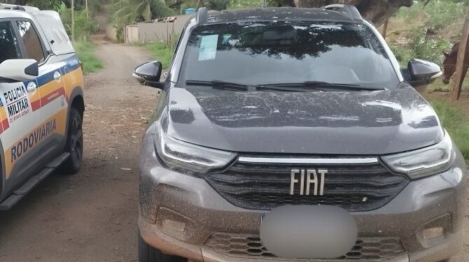 Durante a operação, os policiais abordaram uma caminhonete FIAT/STRADA Volcano, de cor cinza, que apresentava indícios de adulteração nos sinais identificadores.
