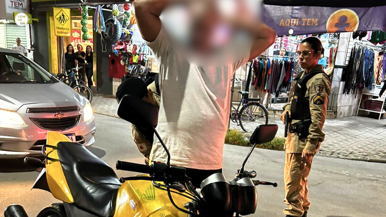 Enquanto relatava o ocorrido aos policiais, a vítima informou que seguiria até um supermercado, próximo dali, para tentar obter mais imagens que ajudassem a identificar a placa da moto usada no crime. No caminho, acabou se deparando com o suspeito trafegando com a mesma motocicleta e usando o capacete furtado.