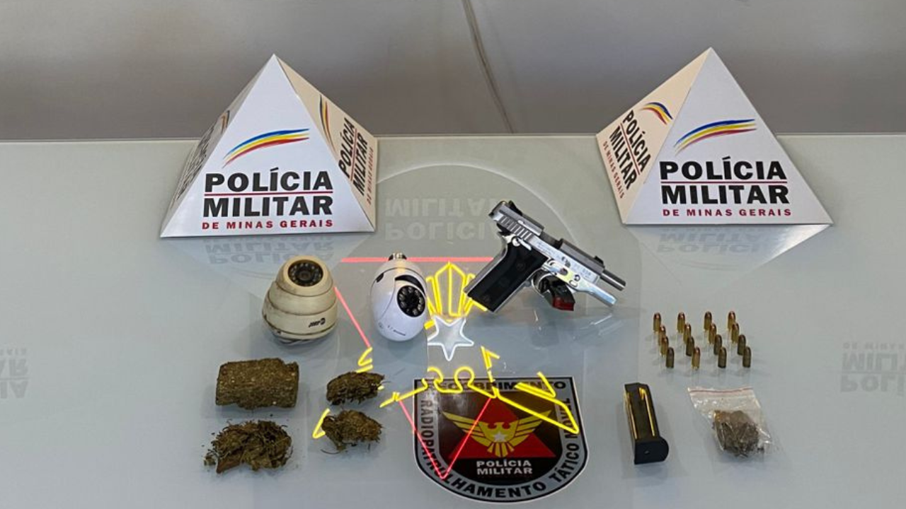 Após revista no local, foram apreendidos uma pistola municiada com 16 munições, um carregador extra e a substância identificada como maconha.
