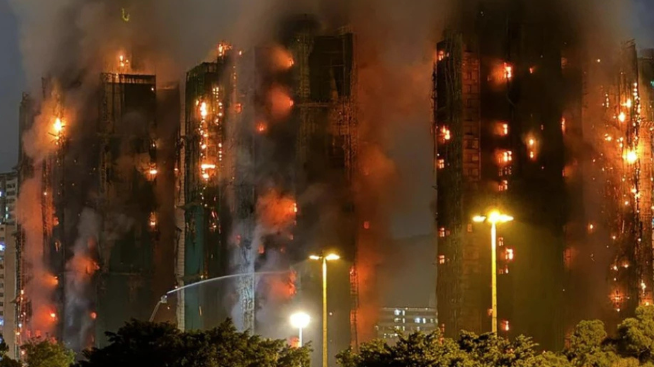O fogo destruiu completamente os andaimes de bambu de ao menos três blocos de apartamentos em Tai Po, no norte de Hong Kong, e depois se espalhou para outras áreas do conjunto residencial Wang Fuk Court.