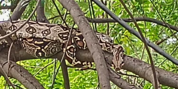 Após ser retirada da árvore e avaliada, a jiboia foi solta em uma área adequada, distante de residências.