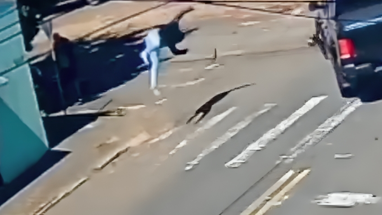 Câmeras de segurança registraram o momento do impacto; vítima foi socorrida pelos bombeiros e levada ao hospital