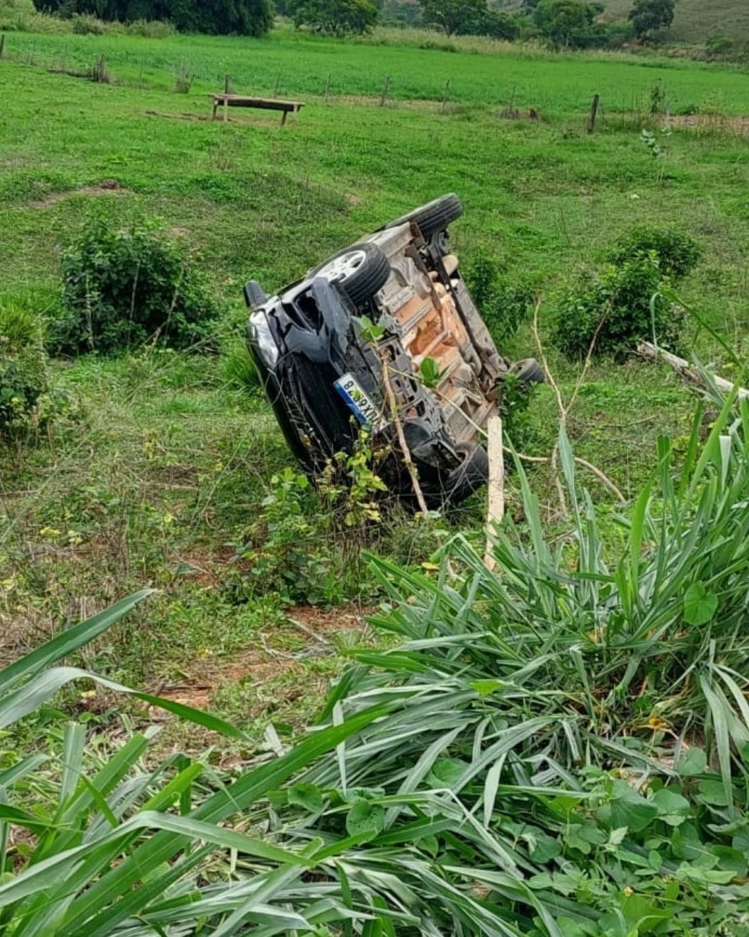 A Polícia Militar Rodoviária foi acionada e, ao chegar ao local, encontrou o Chevrolet Onix tombado em um barranco.