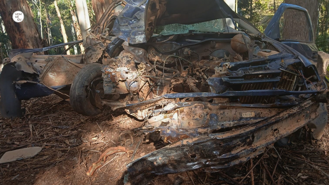 O veículo rodou na pista e colidiu violentamente contra uma árvore de eucalipto às margens da rodovia.