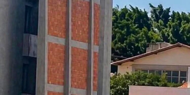 A obra foi realizada inteiramente dentro dos limites do terreno e está regularizada, já que a legislação municipal de Passos não estabelece limite de altura para esse tipo de construção.