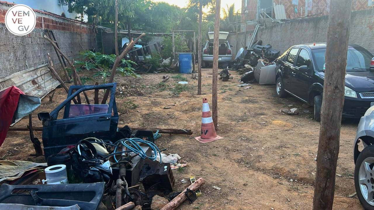 A equipe também localizou diversas peças automotivas espalhadas pelo imóvel: portas, para-choques, escapamentos, bancos, para-brisas e outras peças de diferentes marcas e modelos, em quantidade tão grande que não foi possível catalogar.