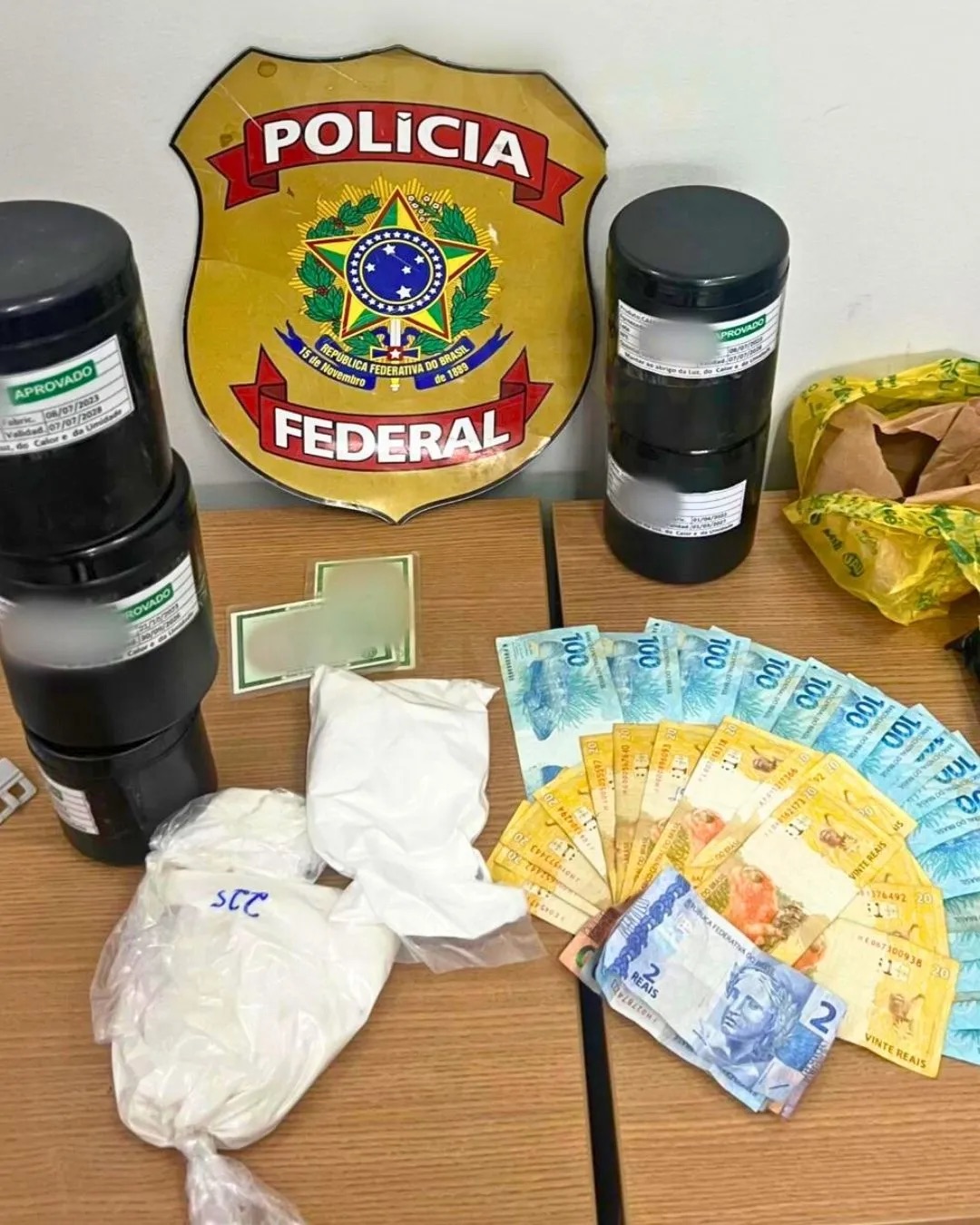 Foram apreendidos 39 quilos de cafeína, 1 quilo de tetracaína e 2 quilos de lidocaína, além de R$ 2.021,00 em espécie.