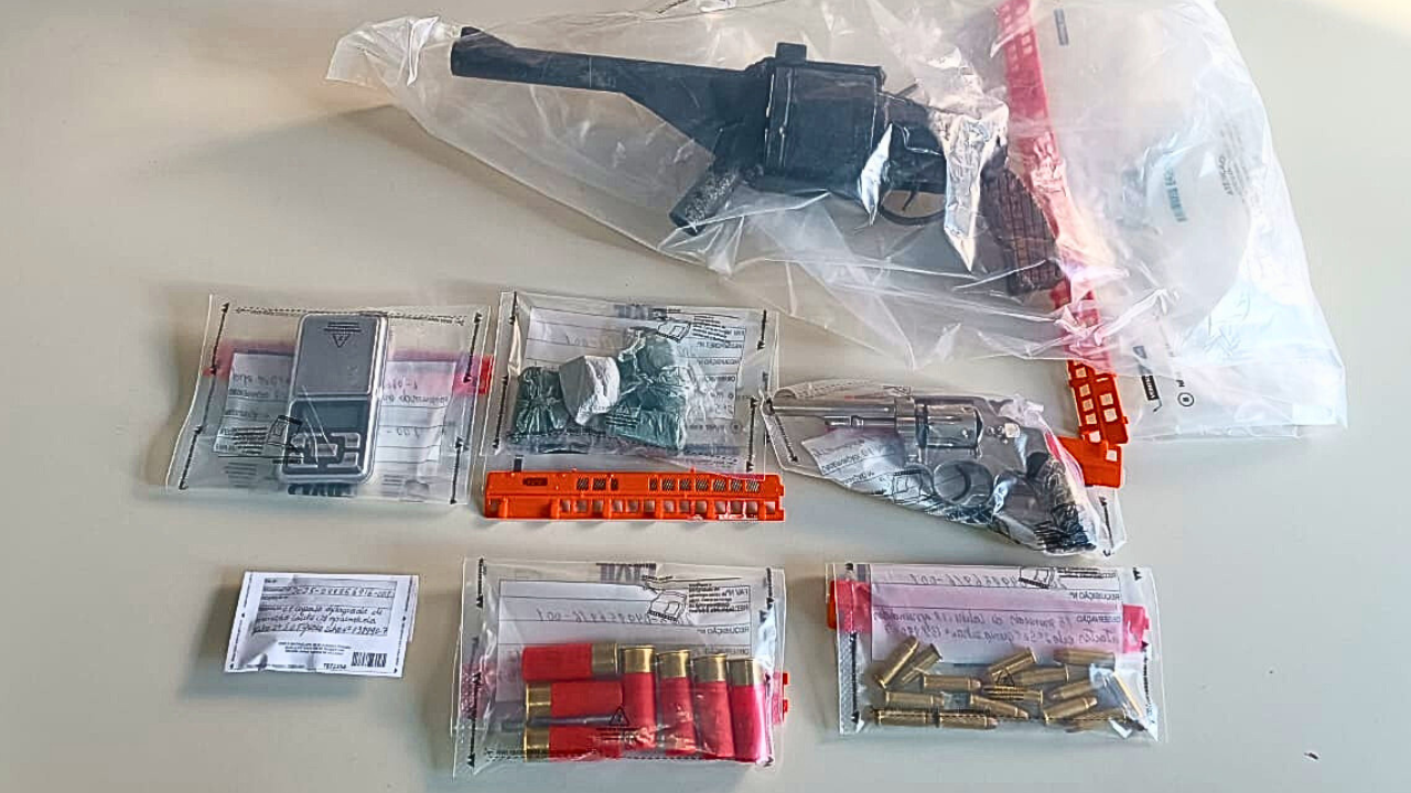 Já em outro cômodo, um revólver calibre .32 desmuniciado foi achado embaixo de roupas.