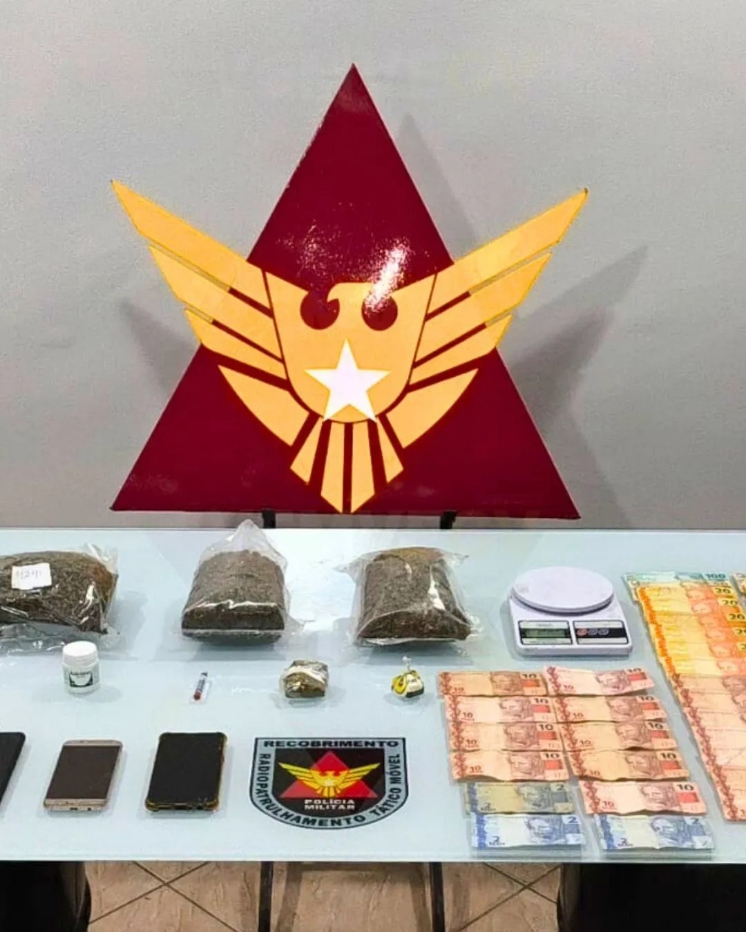 Durante a revista no quarto onde estavam hospedados, foram encontrados: quatro pacotes grandes de skank, uma porção de cocaína, lidocaína, ácido bórico, uma balança, cinco celulares e R$ 696,00 em dinheiro.