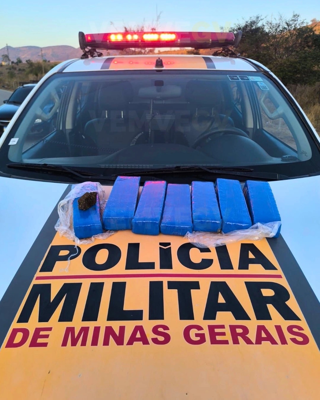 Durante a revista ao veículo, os policiais encontraram sete barras prensadas de substância análoga à maconha, totalizando seis quilos, além de dois aparelhos celulares e a quantia de R$195,30 em dinheiro.