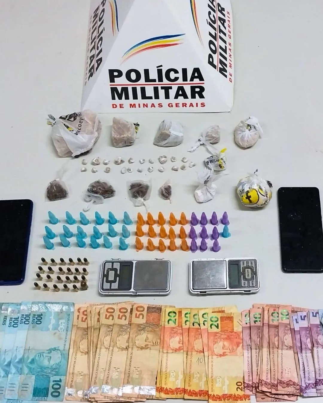No apartamento, foram encontrados diversos itens ilícitos, incluindo R$1.984,00 em dinheiro, 21 pedras de crack, 6 barras de crack, 44 pinos de cocaína, 2 embalagens contendo cocaína, 1 celular Samsung, 1 celular Redmi, 2 balanças, 4 buchas de maconha, 23 munições calibre .22 e 1 munição calibre .380.