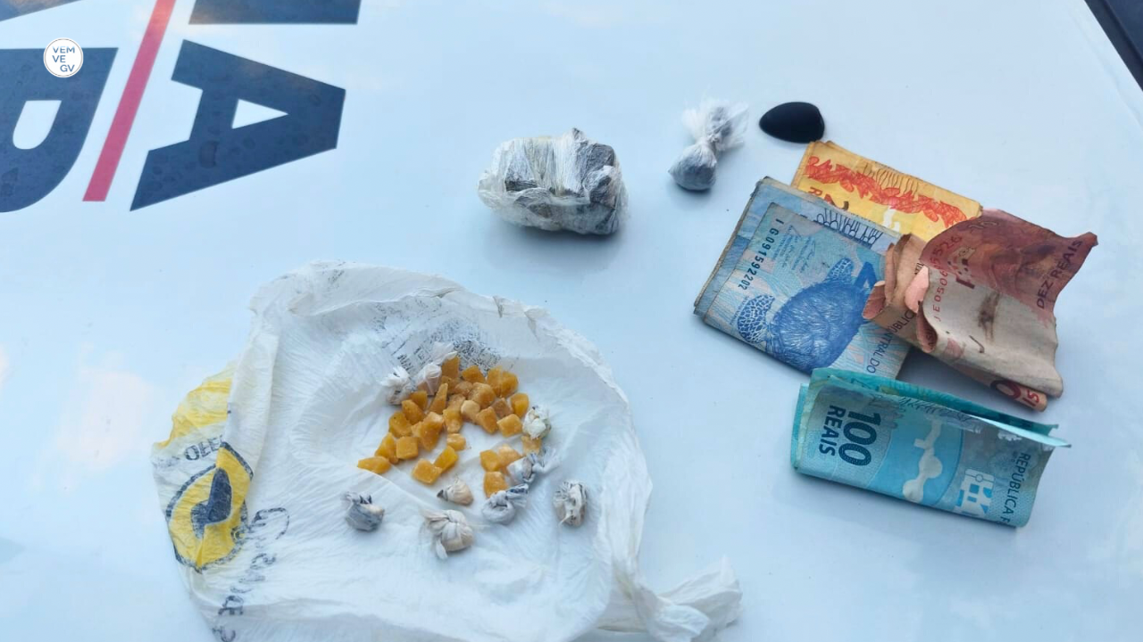 Com ele, foram encontradas 47 pedras de crack, um tablete pequeno e uma bucha de maconha, além de R$ 226,00 em dinheiro.